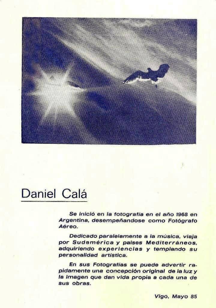 Daniel Calá ha dedicado toda su vida a capturar momentos a través de la lente de su cámara. Su carrera como fotógrafo abarca diversas facetas, desde la fotografía aérea hasta proyectos innovadores que combinan imágenes y música. Uno de sus trabajos más destacados fue un espectáculo llamado "Sonido Color", donde logró fusionar la magia visual de sus fotografías con la emotividad de la música. Además, en los locales que gestionó, siempre expuso sus obras, integrándolas como parte esencial de la decoración y proyectándolas para crear ambientes únicos. Su pasión por el arte visual también lo llevó a realizar exposiciones en Argentina, en Madrid y en Galicia...